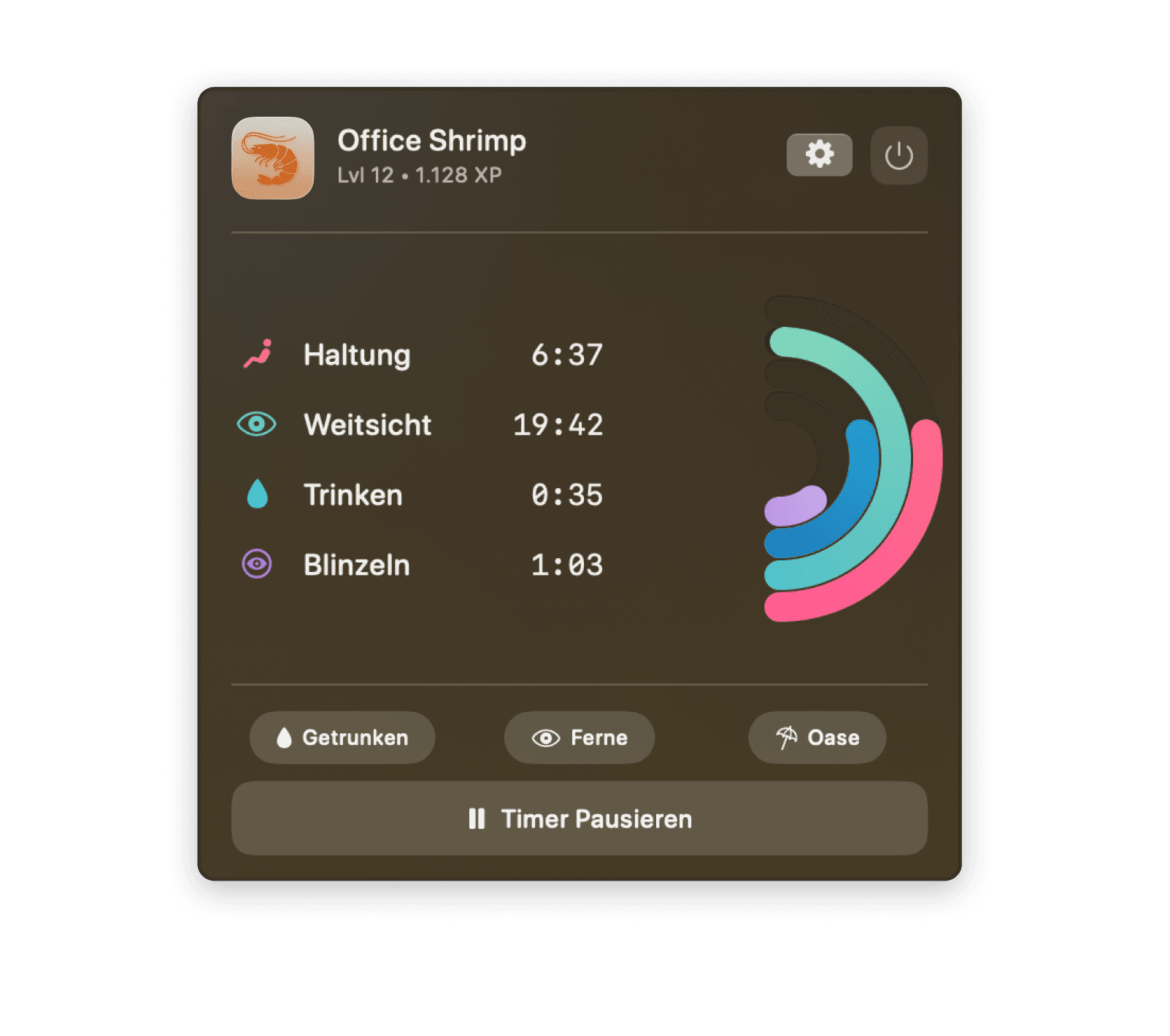 Focus phases that respect your flow. The Shrimp knows when you need a break (The "Oase" Mode).
